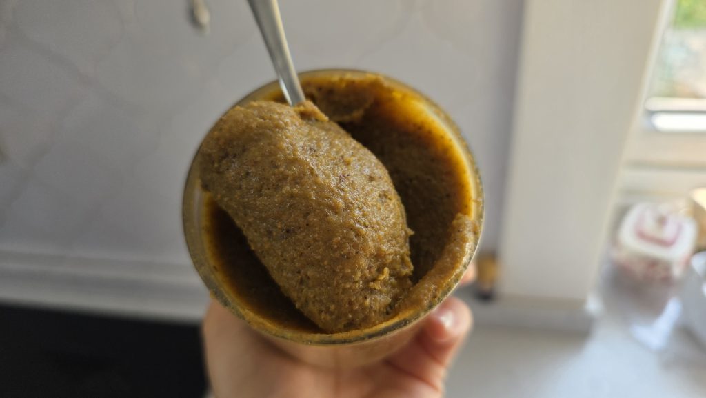 Pentru o textură mai fluidă sunt suficiente doar 2 pungi de fistic, adică 140 g.