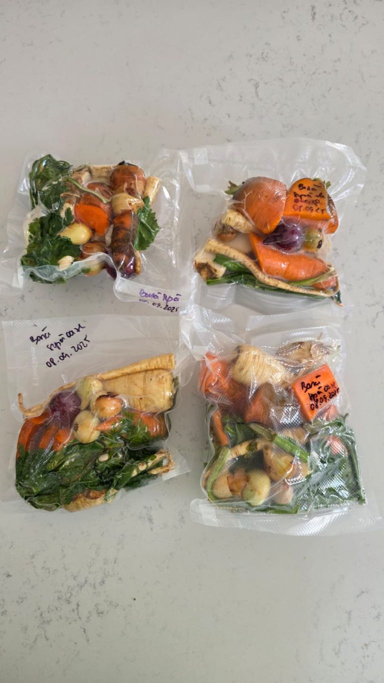 Revenind la legume – căci despre ele vorbim – la fiecare supă, fie că este de vită, de găină sau de porc, pun aceleași legume, obligatoriu: morcov, păstârnac, pătrunjel (rădăcină și frunze), ceapă și usturoi. Adun și resturile de legume de la alte preparate: coji de ceapă uscată sau frunze de ceapă verde, coji de rădăcinoase, uneori chiar cotoare de ardei.
