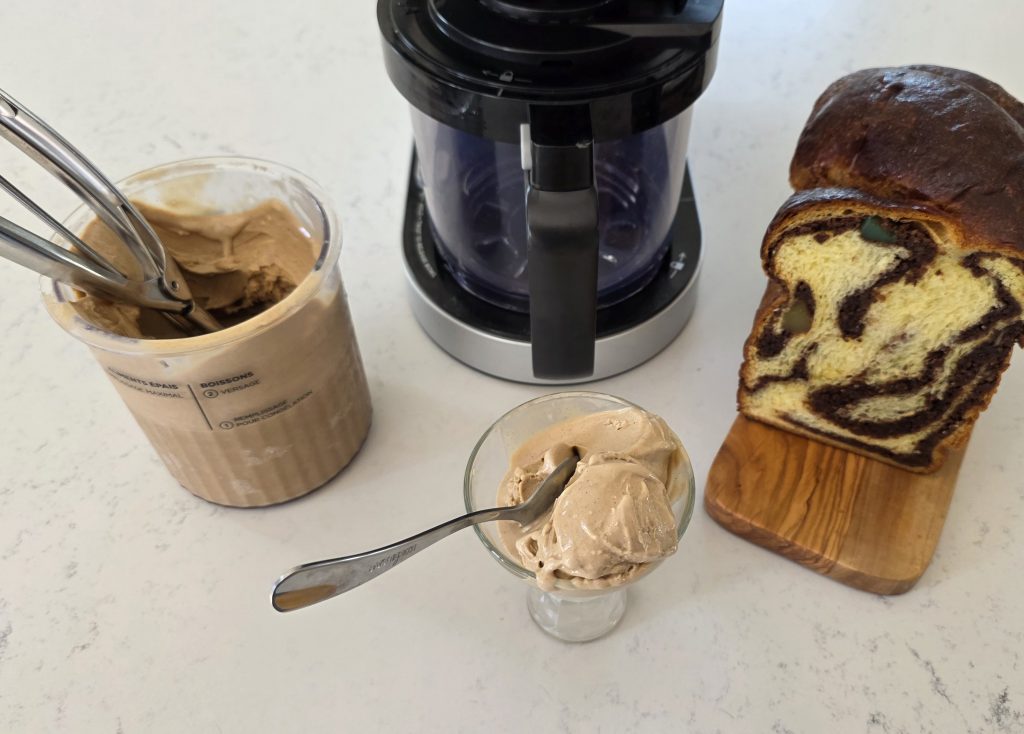 Cât despre aparatul meu preferat de înghețată, Ninja CREAMi, știți deja: simplifică foarte mult procesul de preparare al înghețatei acasă. Pregătim compoziția, o congelăm și apoi aparatul o transformă într-o textură cremoasă.