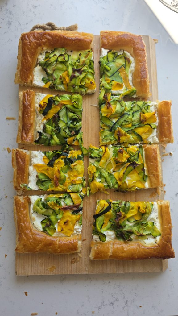 Astăzi facem o tartă simplă, dar plină de savoare: aluat de foietaj, ricotta sau urdă proaspătă, puțin usturoi și 3 feluri de dovlecei: clasici, românești, zuchinni verzi si galbeni (cei mai dulci).